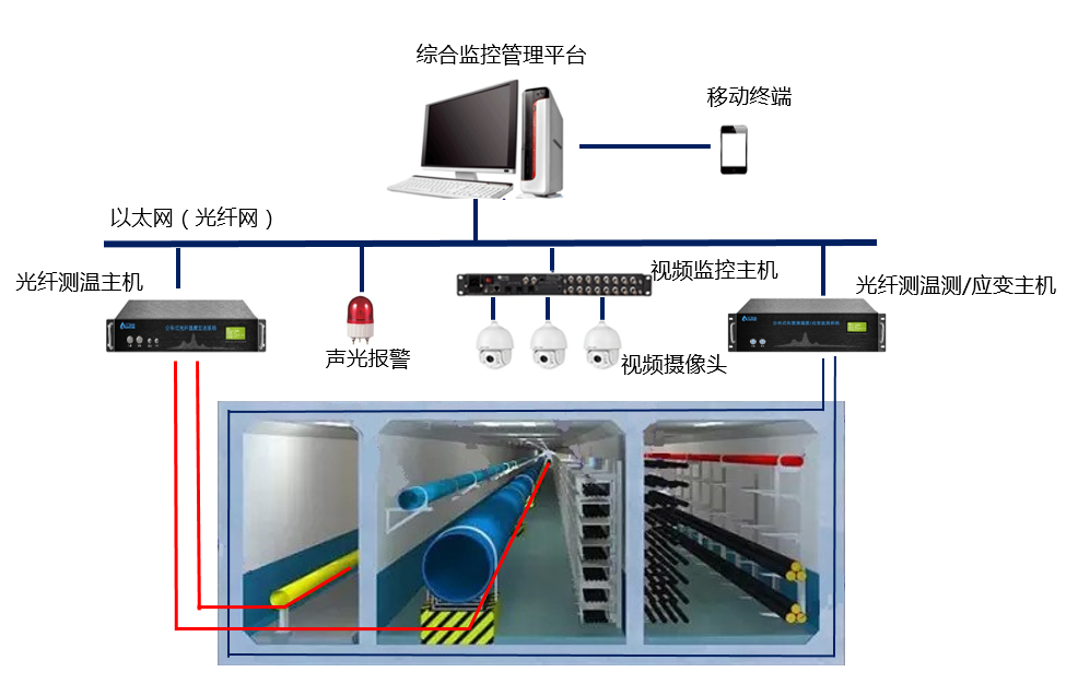 綜合管廊埋于地下,會受到四周土體的擠壓而產生變形、裂縫甚至坍塌的風險,利用分布式布里淵溫度/應變監測系統可對綜合管廊的結構健康實時監測,掌握管廊的結構、受力情況。利用分布式光纖溫度監測系統及分布式光纖振動監測系統對管廊內電力電纜、通信光纜、熱力管道、上水管道等市政管線設施進行全方位監測。