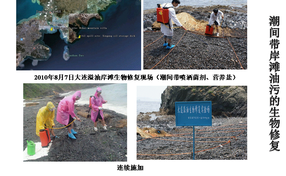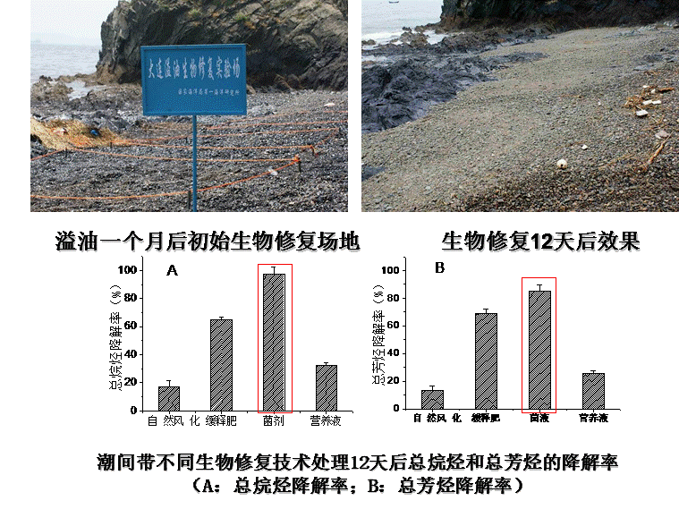 2010年7月16日,大連新港輸油管道爆炸引起的溢油污染事件,該菌劑進行了現場應用。將篩選自海洋的三種石油降解菌經冷凍干燥工藝制備凍干菌粉。現場應用時,需在相應培養基內活化,然后復配成混合菌液,進行場地施用。將復配的菌劑應用于石油污染岸灘,生物修復區降解效果顯著提高,較對照區,其總烷烴和總芳烴的降解率提高70%以上,修復效果顯著。使用菌粉制劑受限于劇烈沖刷的海洋環境,需要對修復區域進行多次噴灑,修復成本較高。