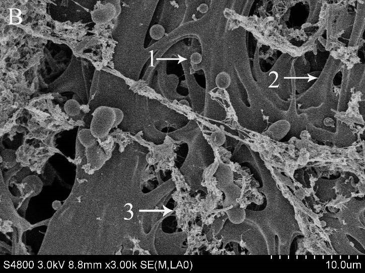 圖A,固定化菌劑顆粒的橫截面結(jié)構(gòu);圖B,固定化菌劑顆粒的內(nèi)部顯微結(jié)構(gòu)。1,固定化細(xì)菌菌體;2,PVA骨架;3,海藻酸鈉和活性炭結(jié)構(gòu)。