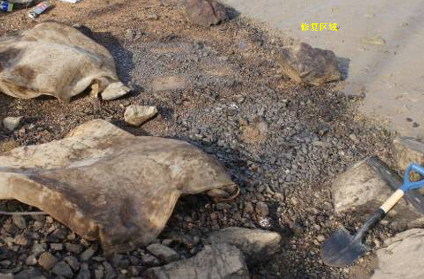 2013年11月22日,黃島溢油事件后,溢油污染了部分膠州灣岸灘,該處岸灘由于地處偏僻,工程車輛較難清理,因而使用本專利所述菌劑對該處岸灘進(jìn)行了生物修復(fù)操作。利用復(fù)合材料制備了固定化修復(fù)菌劑,用于現(xiàn)場修復(fù)實(shí)驗(yàn)。